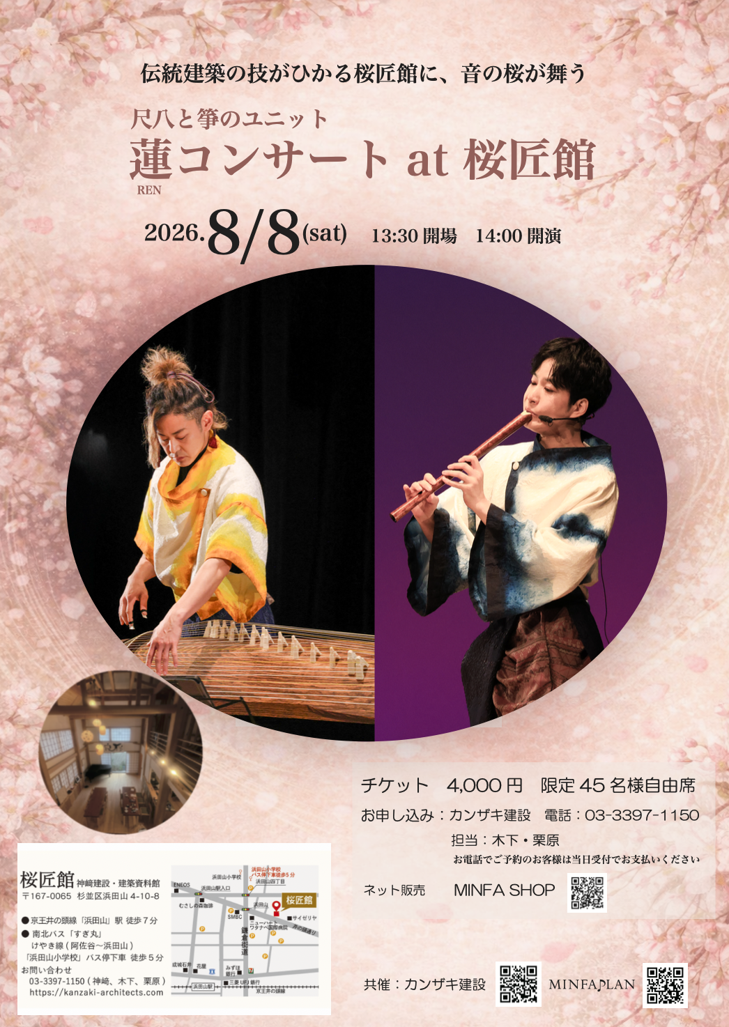「桜匠館」は建物全体が日本の伝統構法を伝承する、生きた資料館。熟練の左官による漆喰壁や館内のあちこちに施された、各職人による美しい桜の装飾も見どころのひとつ。技を伝え、人をつなぐ「桜匠館(おうしょうかん)」にて、蓮のコンサートを開催いたします。